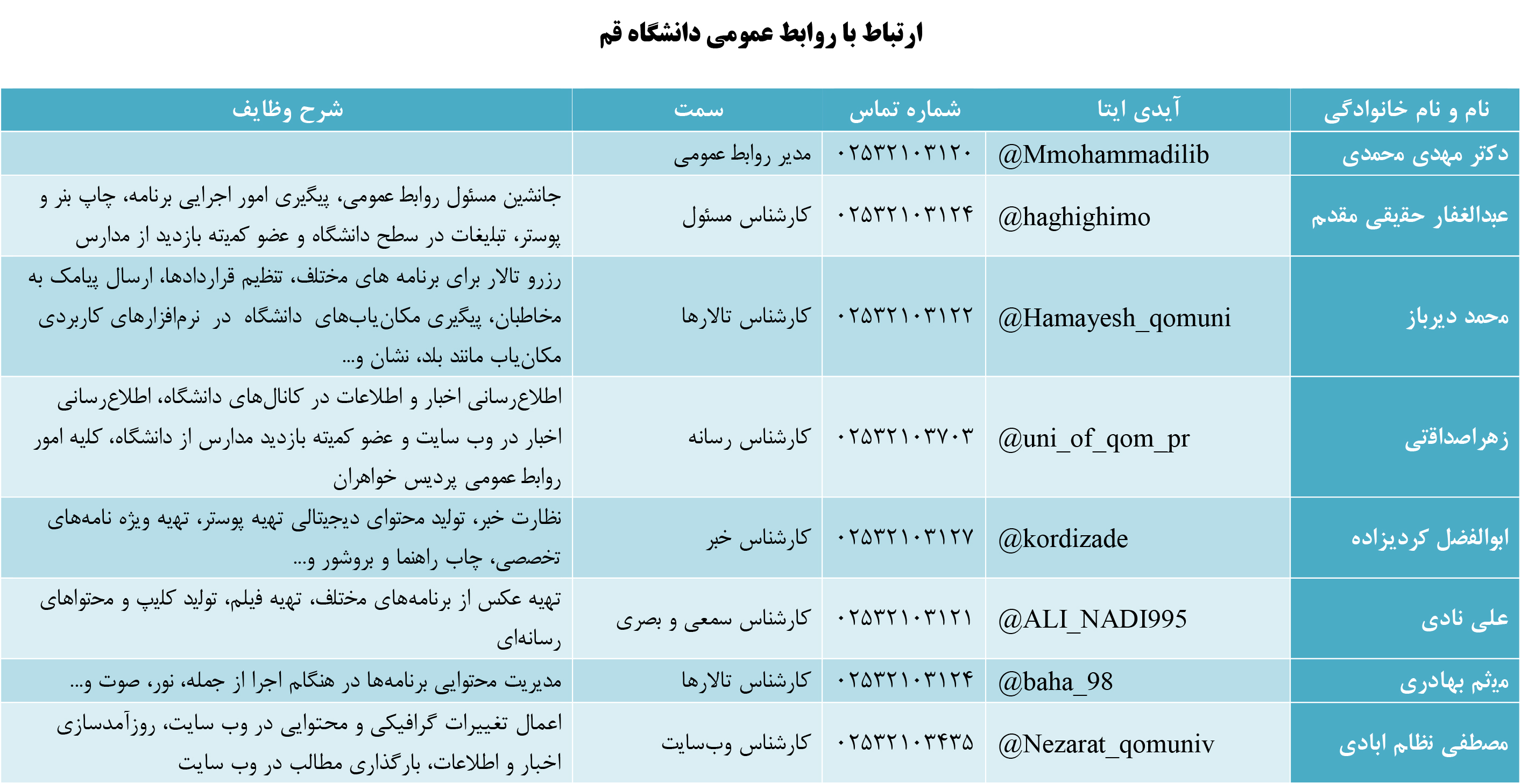 روابط عمومی دانشگاه قم نقش بسیار مهمی در هماهنگسازی، اطلاعرسانی و فرهنگسازی دارد. این بخش از دانشگاه مسئولیت دارد تا جایگاه و شأن دانشگاه را حفظ کند و از آرمانها و فعالیتهای آن دفاع نماید. همچنین، روابط عمومی تلاش میکند تا افکار عمومی را نسبت به عملکرد دانشگاه روشن کند و نیازهای مخاطبین را شناسایی کرده و دانشگاه را در قبال جامعه پاسخگو سازد.